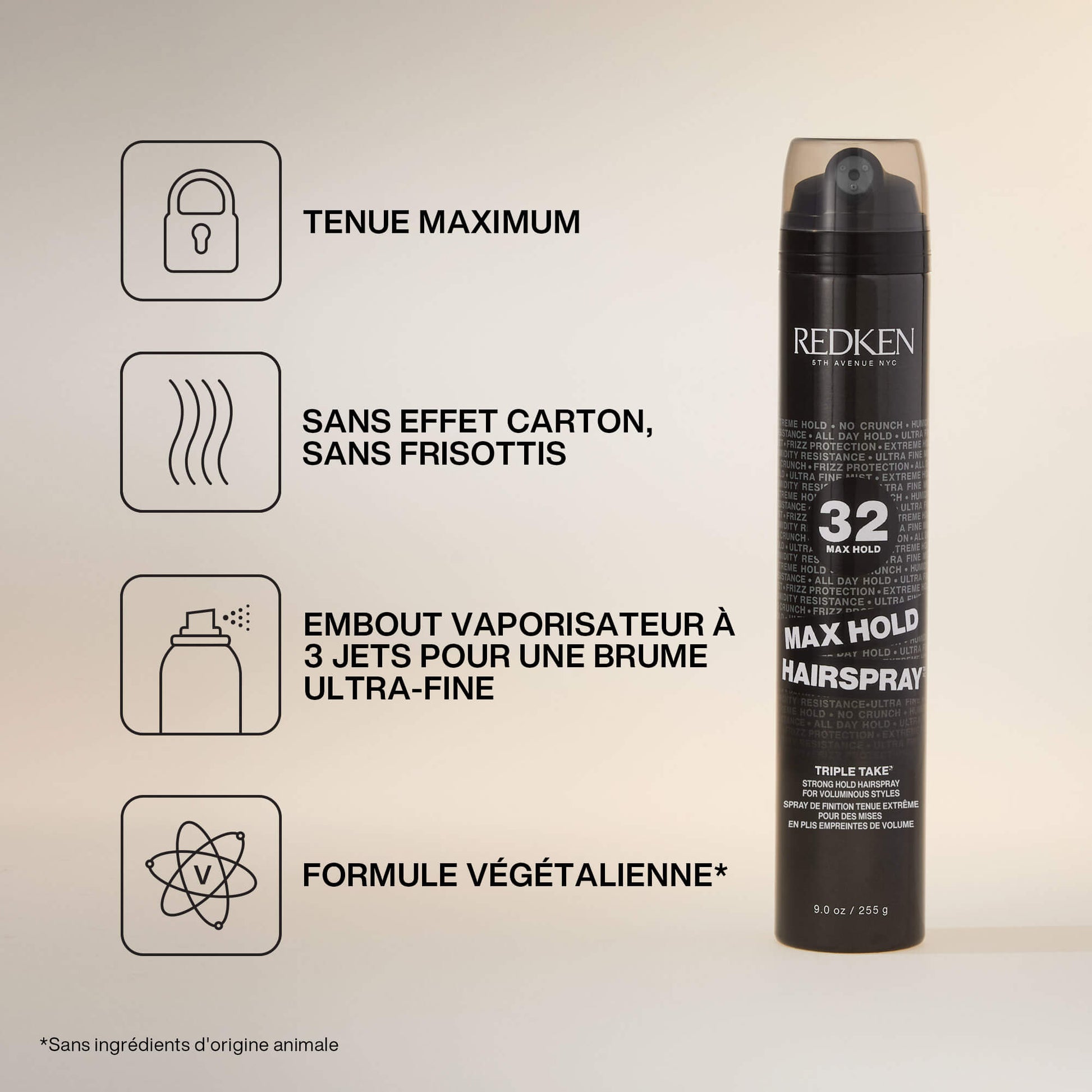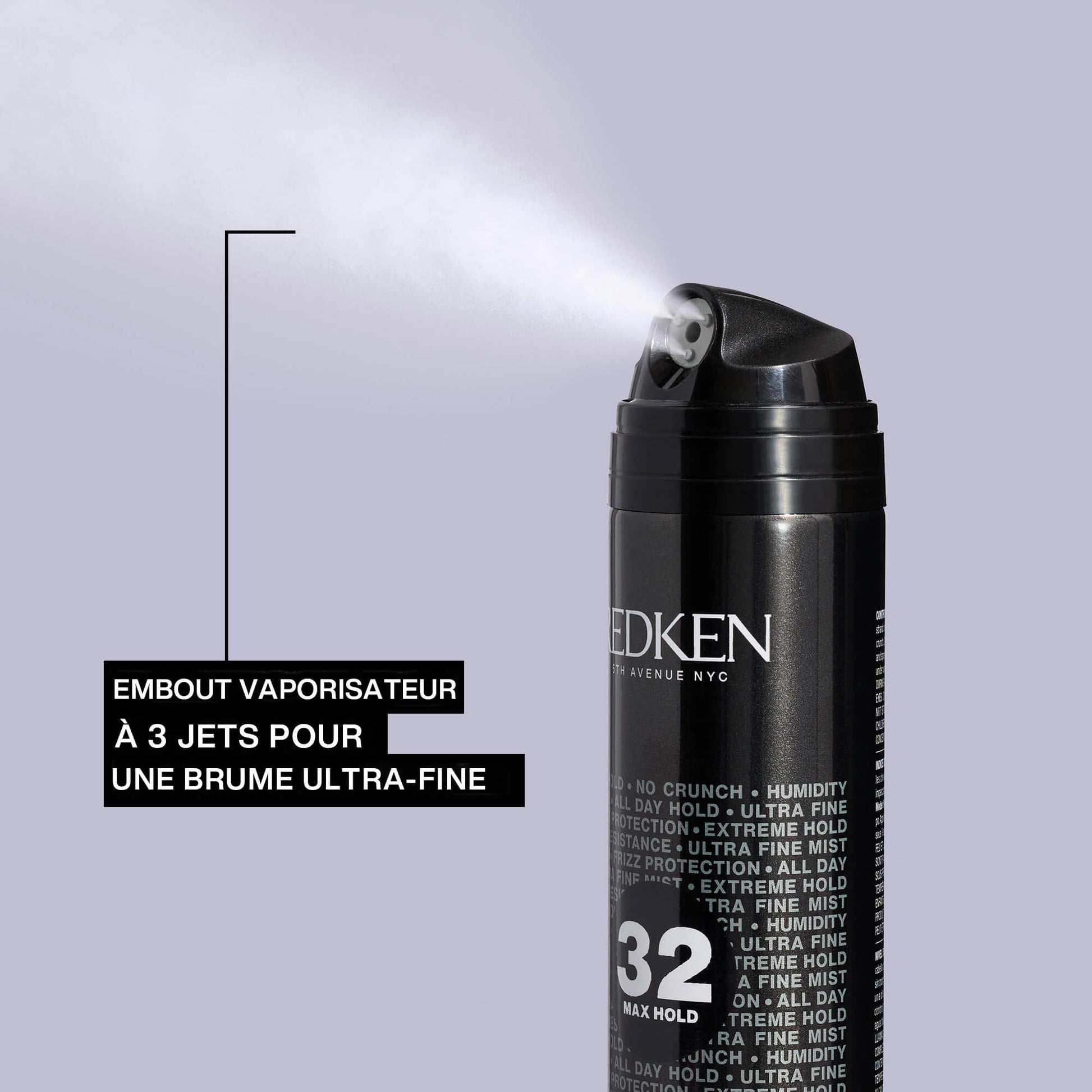 Le spray de finition Max Hold 32 de Redken a une tenue extrême sans effet cartonné. Un spray de finition volumisant offrant une tenue durable. Contrôle et protection contre l’humidité pendant 24 heures.