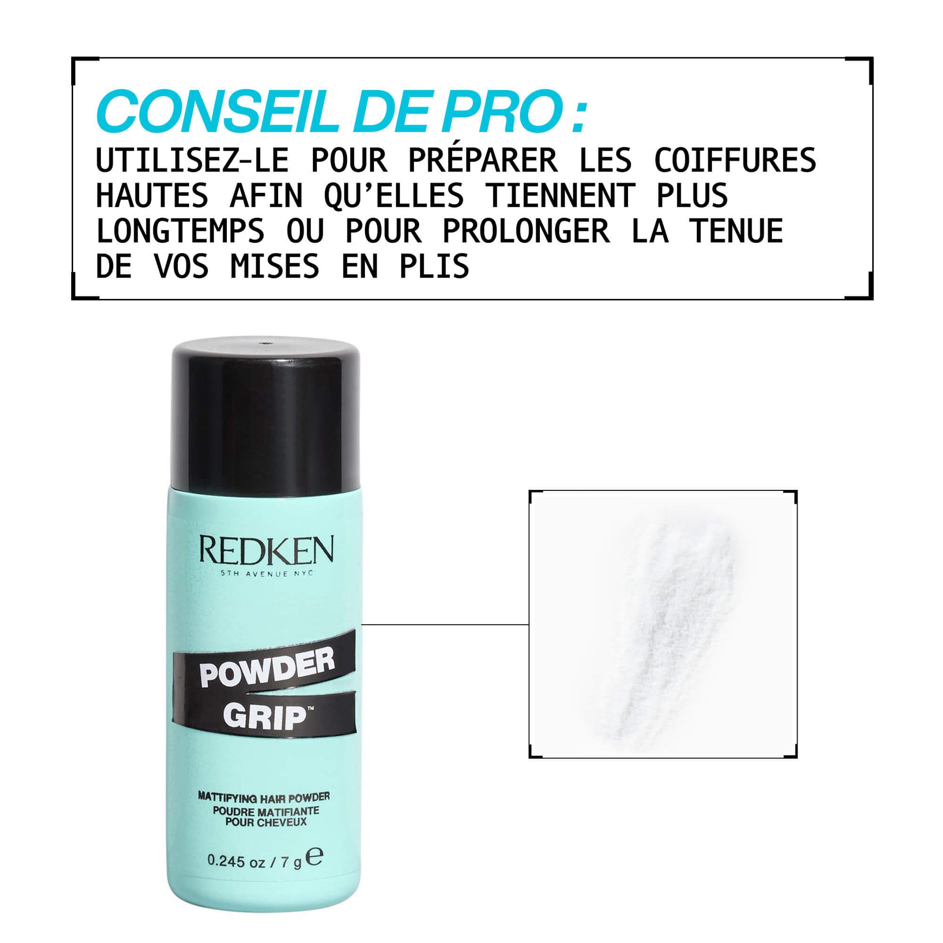 La poudre capillaire matifiante Powder Grip de Redken est volumisante et texturante qui apporte texture et volume pour des chignons durables.